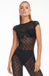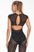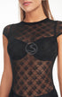 Body en malla elástica con rombos y nuestro monograma con delicadas mangas cortas que equilibran sensualidad y elegancia. que enmarca la cintura y añade dramatismo.
