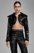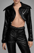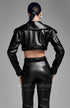 La Jacket Bara tiene una estructura crop con detalles en plisado que moldean la silueta con sofisticación, permitiendo un ajuste perfecto. Es una pieza confeccionada artesanalmente en cuerotex (cuero sintético) con costuras simétricas que abarca toda la prenda.